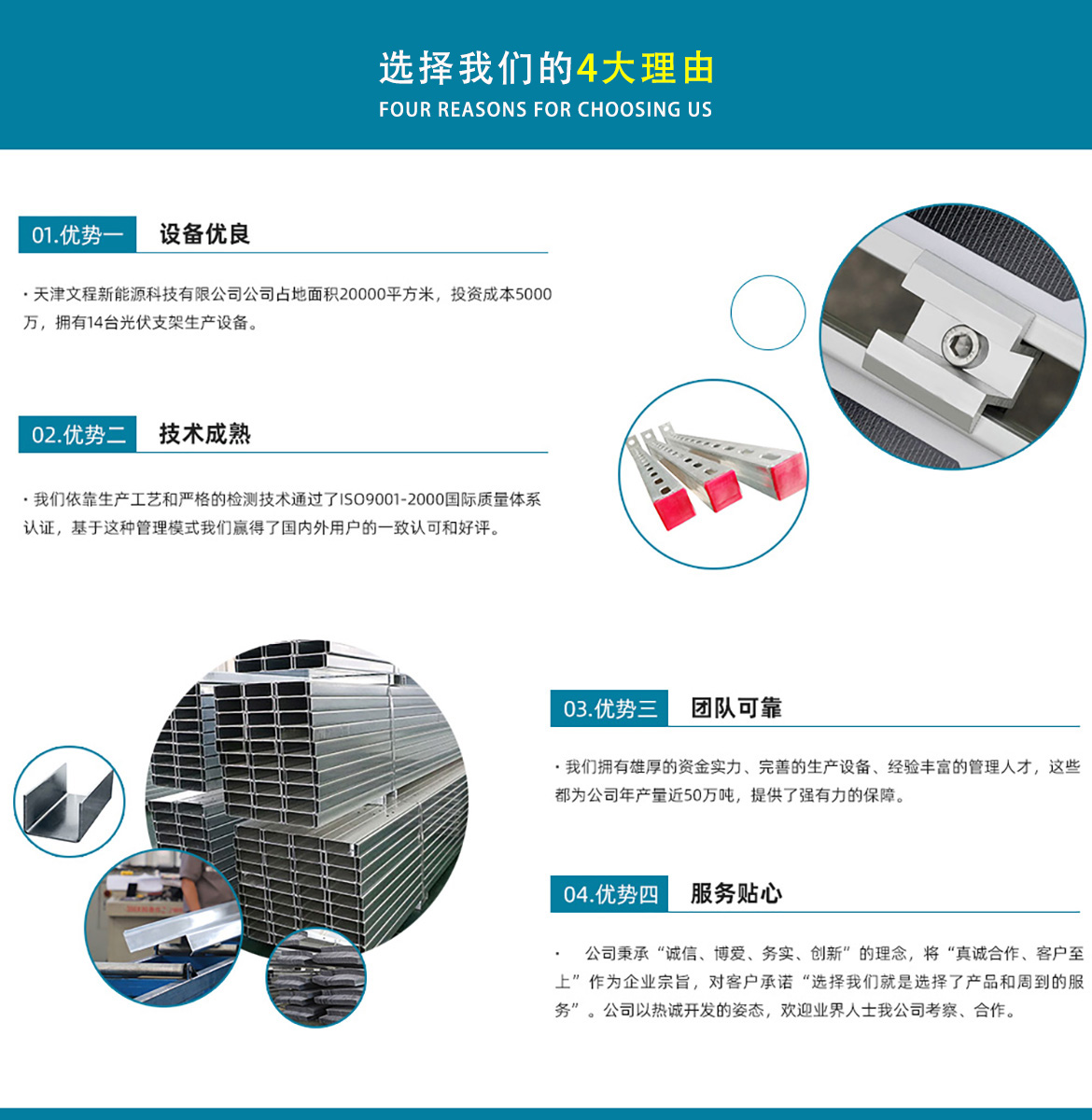 天津文程新能源科技有限公司成立于2021年,是專注于集中式、分布式、漁光互補和農光互補等清潔能源發(fā)電的綜合性企業(yè) 公司是集設計、研發(fā)、生產、制造為一體的綜合型企業(yè)。公司占地面積20000平方米,注冊資金5000萬元整。公司坐落于華北鋼鐵重鎮(zhèn)--大邱莊,距天津市區(qū)50公里、鄰104和205國道及京滬高速,交通十分便捷。 本公司擁有三個生產車間,其中兩個冷彎型鋼車間,一個鋅鋁鎂型鋼車間,擁有自動冷彎成型機10條,自動數控沖孔機10條以及焊接加工等設備。主要生產產品有:太陽能光伏支架、各種規(guī)格的C/Z/U型鋼、抗震支架、管廊支架及整套配件等。